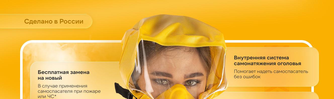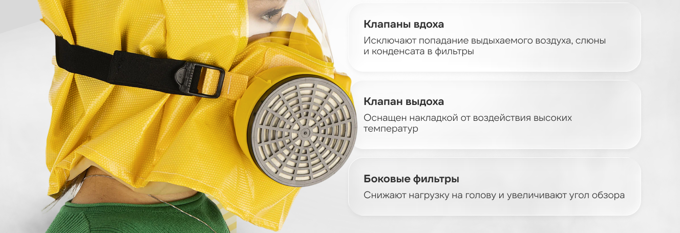 - Боковое расположение фильтров самоспасателя не ограничивают подвижность головы и шеи, при наклоне головы вниз не происходит нарушения герметичности за счет сдвига полумаски.
